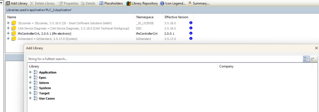 Two libraries are needed, the standard library with Codesys standard functions and function blocks (such as the TON function block), and the IFM IO library