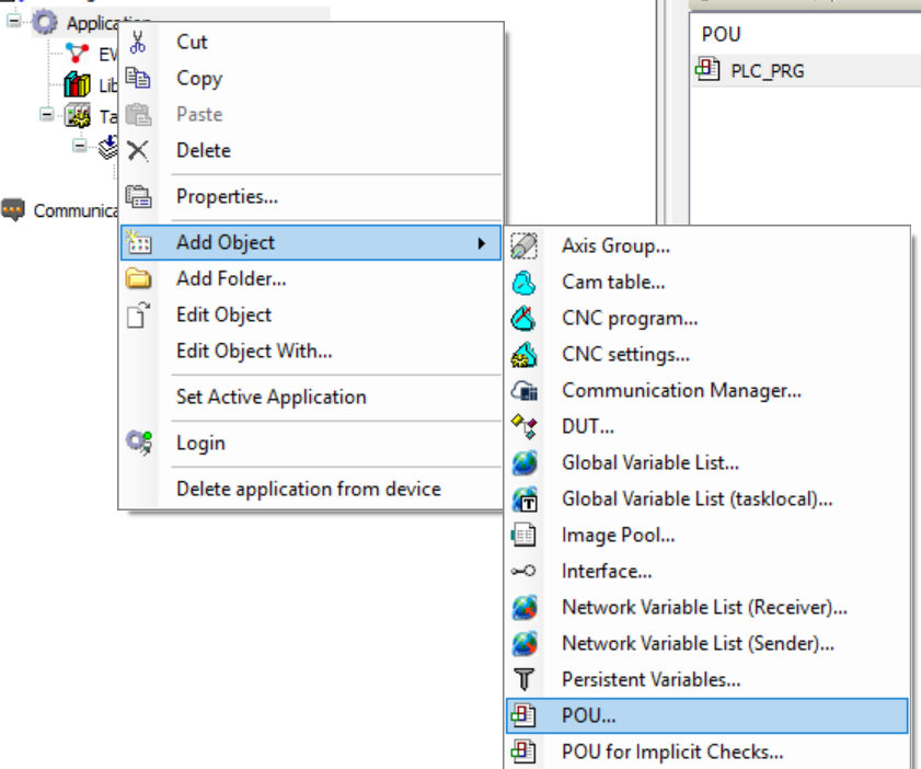 Codesys relies on an entry point, a POU named “PLC_PRG (¨PRG)”. This POU is called by the Task with the same name (you can also configure the task by double-clicking on “Task”). There is no need for the POY to be of a particular type, and as I am more used to coding, we will replace the existing “PLC_PRG (PRG)” of PLC_2 with an ST formatted PLC_PRG (PRG).